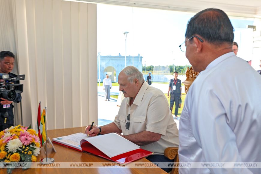 Торжественной получилась и сама церемония встречи Александра Лукашенко и Мин Аун Хлайна. Главу белорусского государства приветствовала рота почетного караула, а оркестр исполнил гимны Беларуси и Мьянмы. После совместного фотографирования Александр Лукашенко оставил запись в книге почетных гостей Президентского дворца.