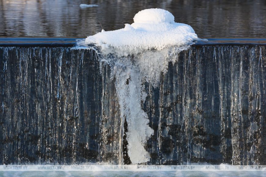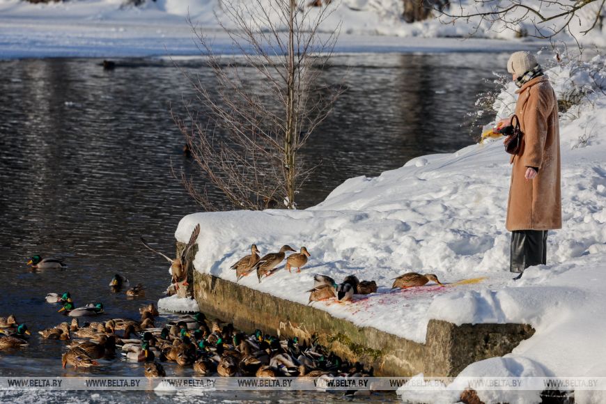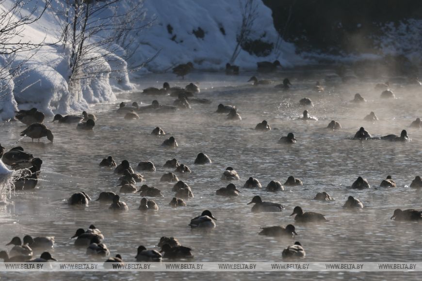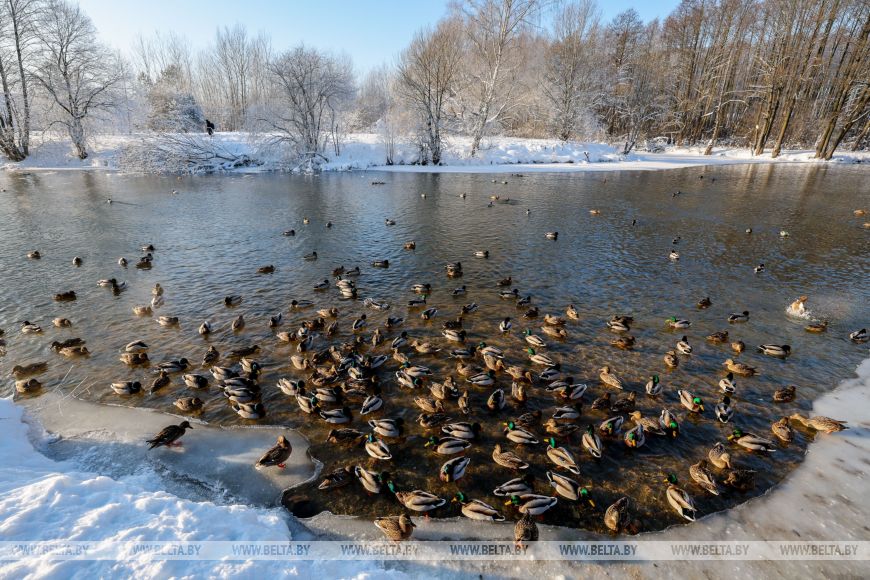 17 января, Минск /Корр. БЕЛТА/. На водохранилище в Дроздах царит атмосфера солнечной зимней сказки. Несмотря на морозную погоду и плотный снежный покров на берегах, акватория остается местом притяжения для местных обитателей. Стая уток, не улетевших на юг, активно плавает среди причудливых ледяных образований, греясь под лучами яркого зимнего солнца.-0-