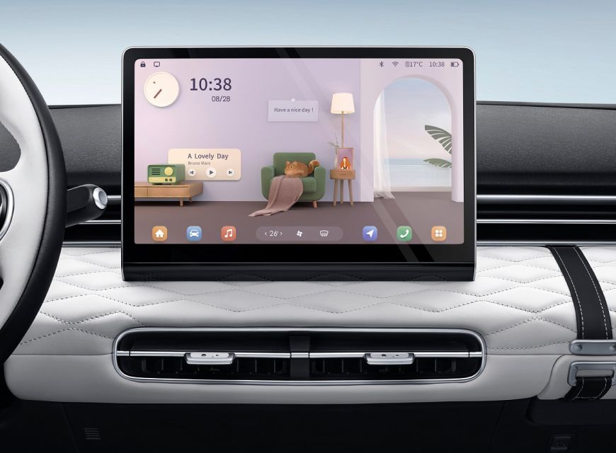 Мягкая отделка, контрастные вставки с ромбовой прострочкой, цифровая приборная панель и 12,8-дюймовый UltraHD-экран мультимедиа образуют пространство, где гармонично сочетаются технологии и премиальный стиль.