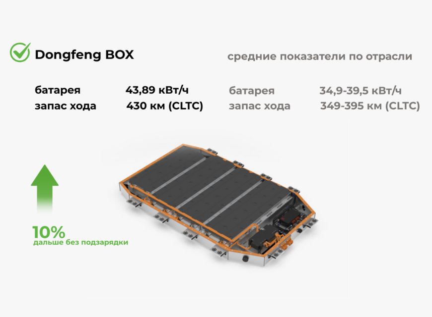 BOX 430 MAX уверенно опережает многих одноклассников: его запас хода на 10% больше среднего показателя сегмента. Хетчбэк оснащен максимальной для модели батареей (43,89 кВт·ч) и способен преодолеть до 430 км (CLTC).